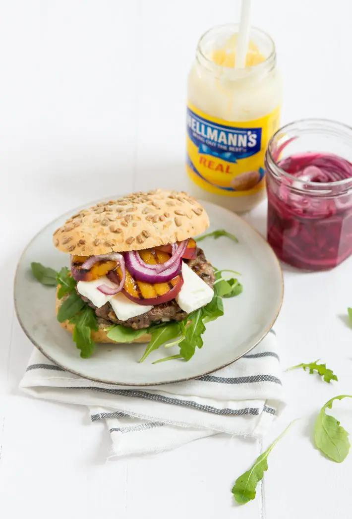Ik ben met het recept aan de slag gegaan en heb een paar dingetjes getweaked. Ik heb een hamburger gemaakt van rundvlees dat ik gekruid heb met een klein beetje chipotle (mijn nieuwste verslaving). Dat geeft een lekker smokey flavour aan de burger. Ik heb de perzik kort gegrild in een grillpan. Daardoor wordt hij nog zoeter en is het nog lekkerder met het zoute van de feta. De perzik maakt het tegelijk ook lekker juicy. Extra fijn met het romige van Hellmann’s. En voor de finishing touch voegde ik zoetzure uien en nog een lekker stroperige balsamico toe. Mmm…