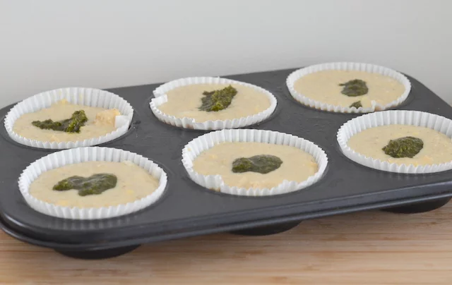 Verdeel het beslag over 6 muffin-papiertjes. Verdeel een tl pesto over iedere muffin.