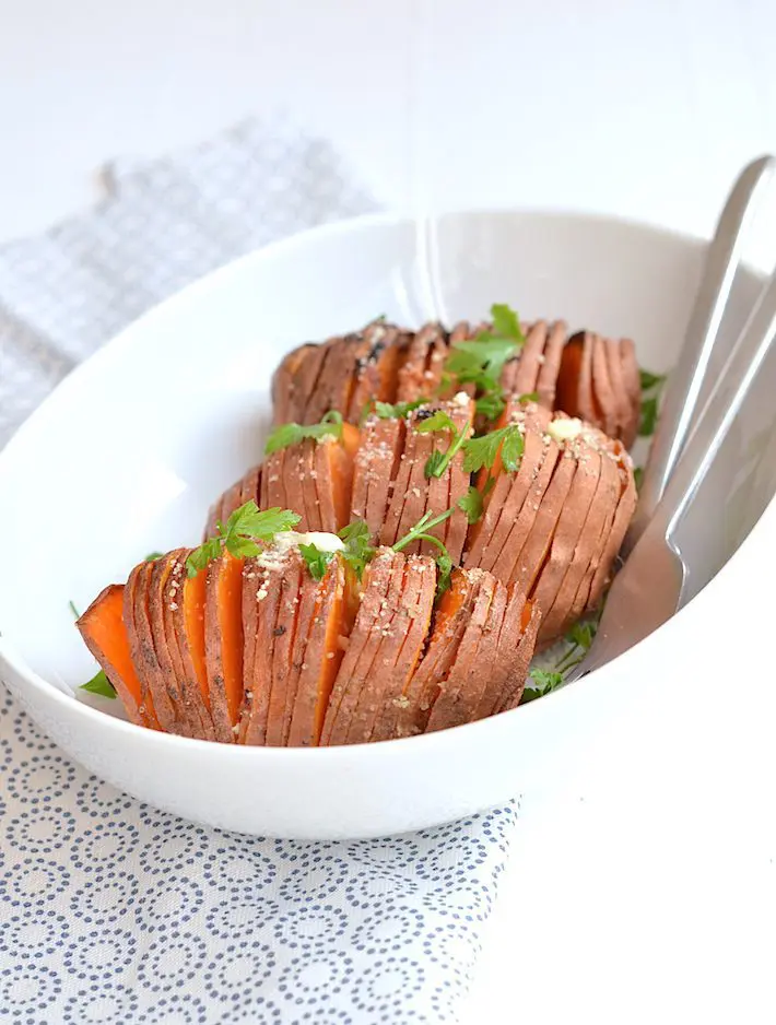 Je kent ze vast wel, waaiertjes gemaakt van aardappelen. Hasselback potatoes noemen ze dat met een mooi woord. En die kun je ook prima maken van zoete aardappel. Het idee is heel simpel, je snijdt een aardappel in hele dunne plakjes. Daarbij zorg je ervoor dat het één geheel blijft, dus je snijdt de aardappel niet helemaal door. Wat overblijft is een mooie aardappelwaaier.