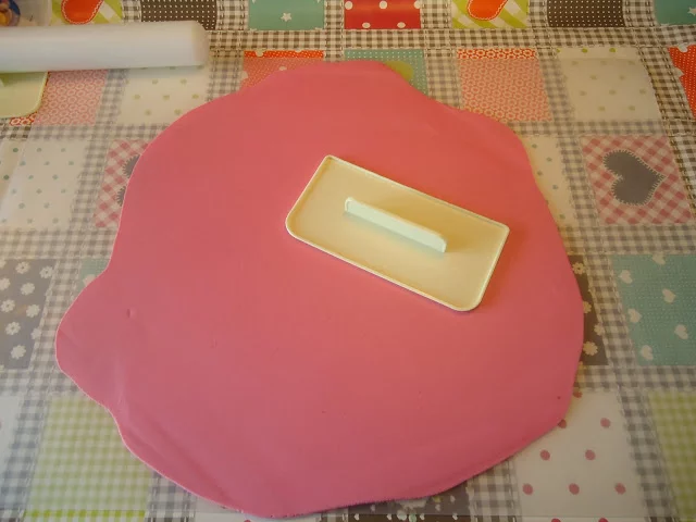 Vervolgens ga je de marsepein uitrollen. Doe dit op een non stick ondergrond zoals de bureaulegger van de IKEA. Het voordeel van deze mat is, dat de marsepein hier niet aan vast blijft kleven. Heb je geen bureaumat en blijft je marsepein wel kleven, gebruik dan wat crisco of poedersuiker op je opppervlak. Het uitrollen gaat het makkelijkste met een grote non stick roller van Wilton. Je kan dit eventueel ook met een deegroller doen. Zorg dat je de lap marsepein zo gelijkmatig mogelijk uitrolt tot een dikte van ongeveer 3 mm. Meet de lap even na, zodat deze groot genoeg is voor je taart.