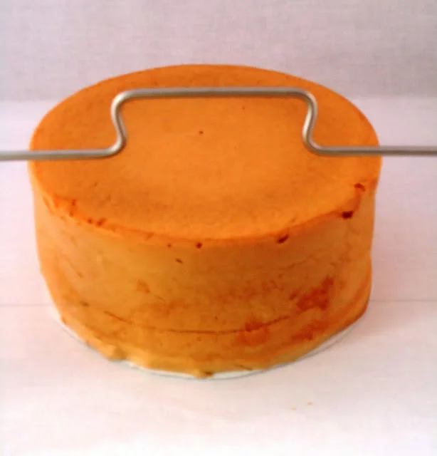 Snij de taart doormidden zodat er 3 lagen ontstaan. Het makkelijkste is om een taartzaag te gebruiken. Deze zorgt ervoor dat je taart gelijkmatig doormidden gesneden wordt. Je snijdt de taart twee keer doormidden, zodat er 3 gelijke lagen ontstaan.