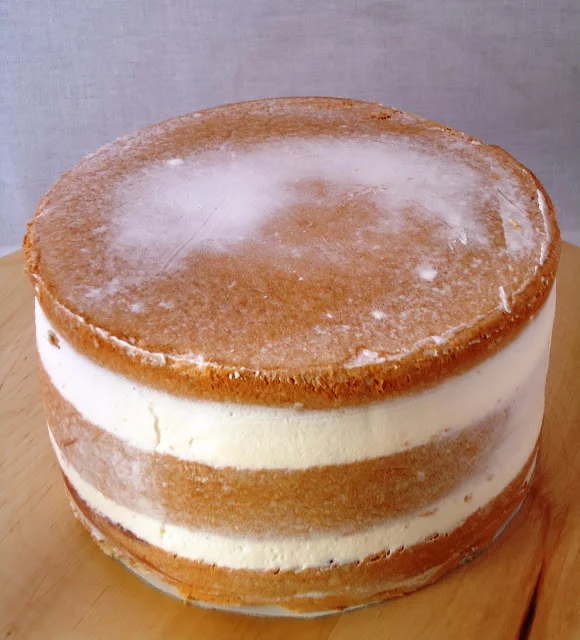 Vervolgens ga je de taart vullen. Het is belangrijk om het biscuit weer op dezelfde wijze op elkaar te stapelen. Een handige tip: smeer een lik botercrème op de zijkant en kerf deze in met een mes. Zo zie je precies hoe je de lagen weer op elkaar moet stapelen.