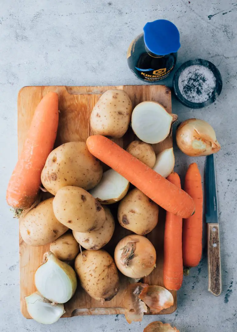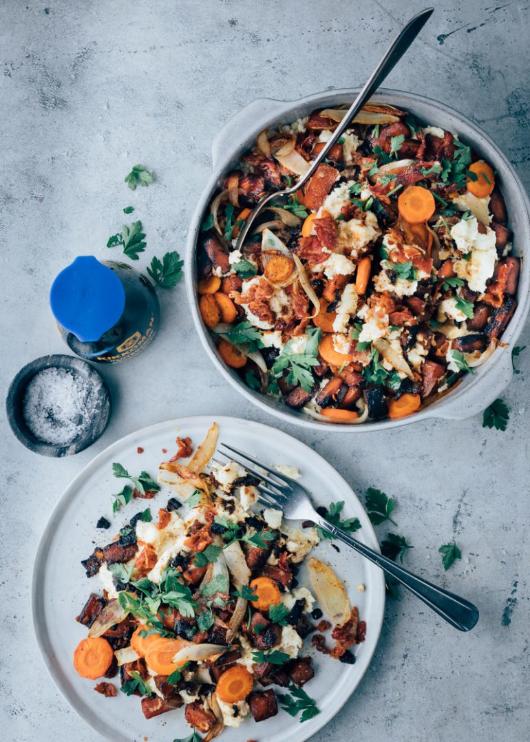 Dit wortelstamppot recept is een superleuke variant op de klassieke hutspot die je waarschijnlijk wel kent. Deze keer koken we de hutspotgroenten niet maar wokken we de wortels en uien in Kikkoman sojasaus en Chinese vijfkruidenpoeder. Ja echt! Hiermee geef je er een lekkere Aziatische twist aan. De wortels gaan een beetje karameliseren en krijgen hierdoor een heerlijke zoete smaak. Erg lekker in combinatie met de romige aardappelpuree met crème fraîche. Stamp de gewokte wortelen er doorheen en een nieuwe stamppot favoriet is geboren. Als finishing touch, serveren we er in honing gebakken spek bij. Dat zoet zoutige is echt heerlijk. Liever Vega? Dan kan je deze stap overslaan.