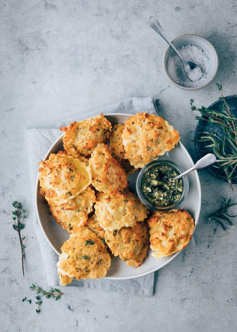 Dit is een heel erg leuk Italiaans hapje. Simpel om te maken en ontzettend lekker. Leuk voor op de borrelplank of als antipasta bij een Italiaans etentje. Je maakt dit Italiaans hapje van kant-en-klare verse ravioli. Wij gebruikten de allergrootste die we konden vinden. Die heet officieel mezzelune, maar het kan dus ook met ravioli. Verzamel je favoriete Italiaanse kruiden, gebruik hiervoor verse kruiden, die geven het lekkerste resultaat en hak ze fijn. Maak dan een mengsel van ei, broodkruim (of paneermeel), geraspte parmezaanse kaas en fijngehakte verse kruiden en doop daar de ravioli in. Leg ze op een bakplaat en schuif de ravioli in de oven. Bak ze mooi goudbruin en klaar is je Italiaanse hapje. Wij serveren dit hapje met een zelfgemaakte walnoten pesto!