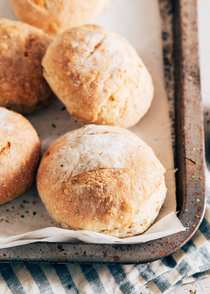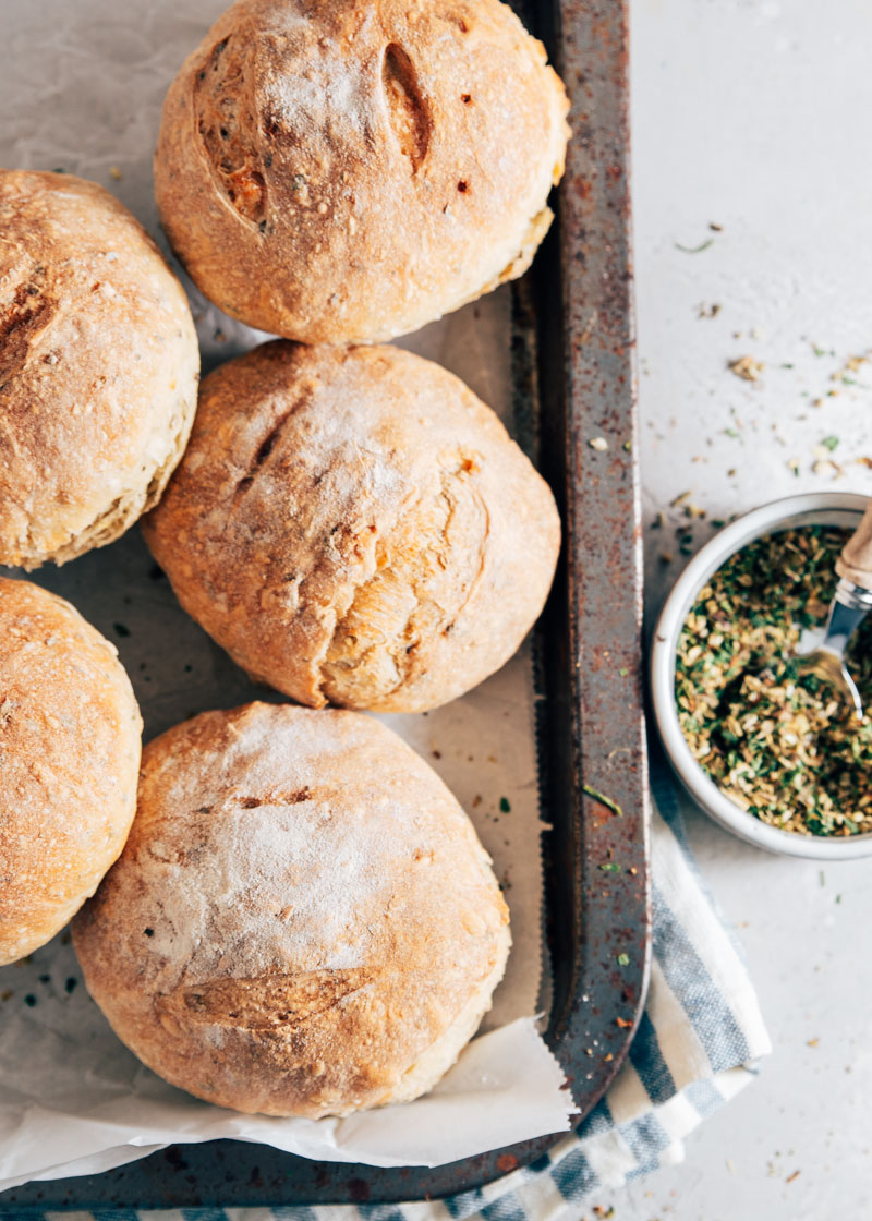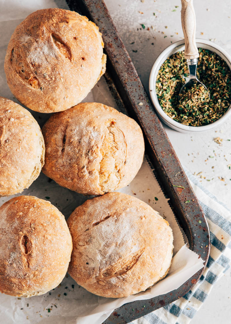 Wil je eens iets anders? Vervang de Italiaanse kruiden door gedroogde rozemarijn en voeg een snuf zeezout toe voor een extra zoutig broodje. Of strooi wat geraspte Parmezaan over de bollen voor een extra knapperige en kazige korst.