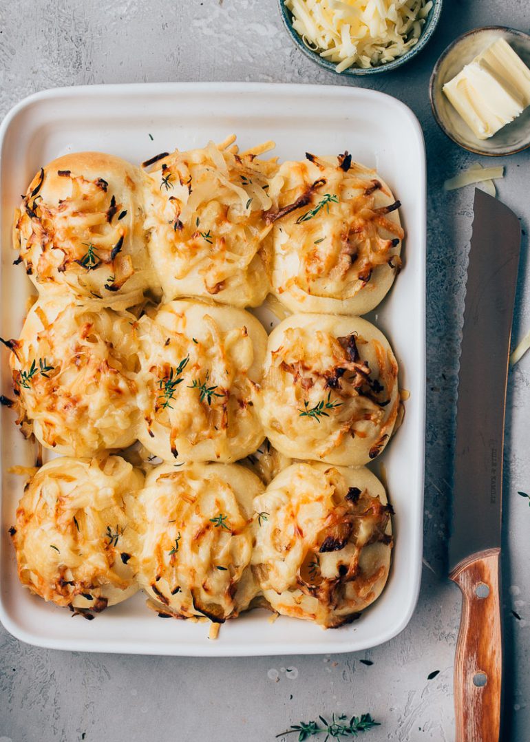 Verdeel de gebakken uien over de broodjes en bestrooi ze rijkelijk met geraspte kaas. Bak de kaas uien broodjes in ongeveer 20- 25 minuten af op 200 graden.
