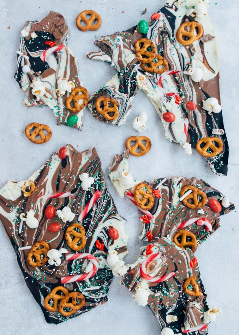 Deze kerst chocola is ideaal om left-over chocolade en overgebleven snoep, die je rond deze tijd van het jaar in je voorraadkast hebt liggen, mee op te maken. Dit simpele recept met waanzinnige looks is bovendien ontzettend leuk om samen met kids te maken! Je kunt het eventueel in leuke zakjes of doosjes verpakken en weggeven tijdens de kerstdagen. Zo heb je supersnel een leuk culi cadeautje gemaakt. En wie lust er nu geen kerst chocola vol snoepgoed?