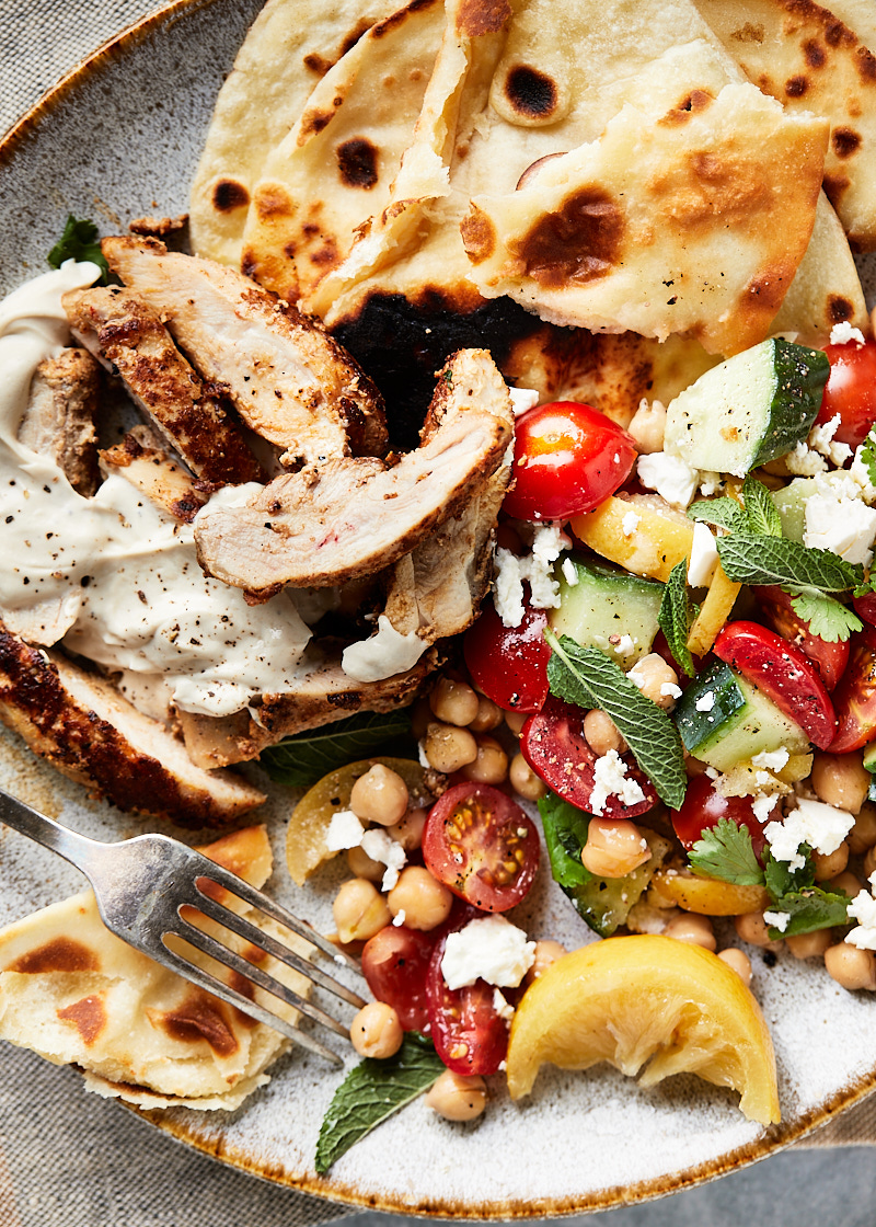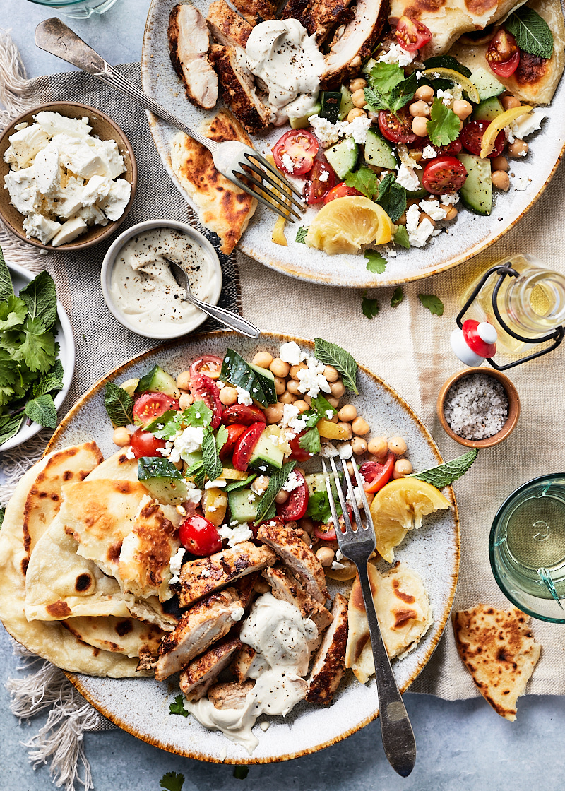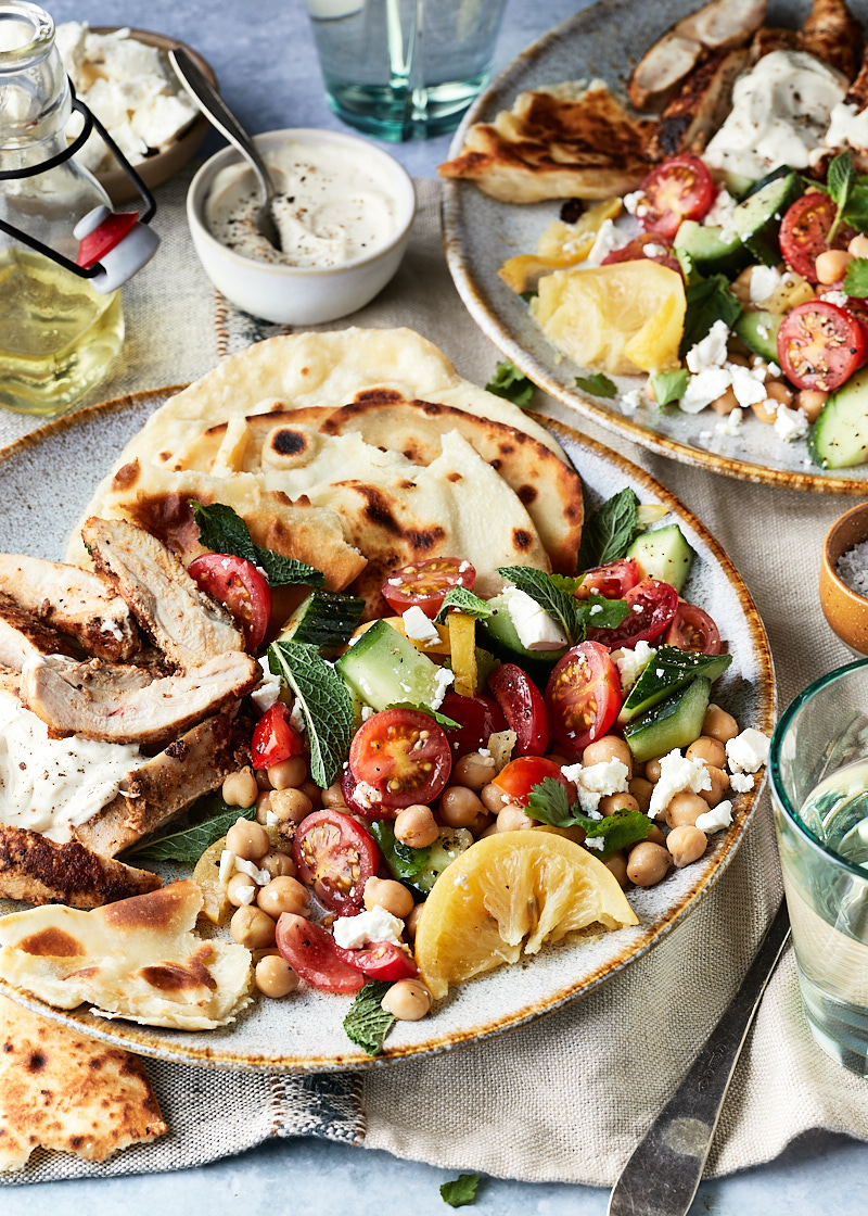 Verdeel de salade over de borden. Leg op elk bord wat kip, platbrood en serveer met de tahinsaus.