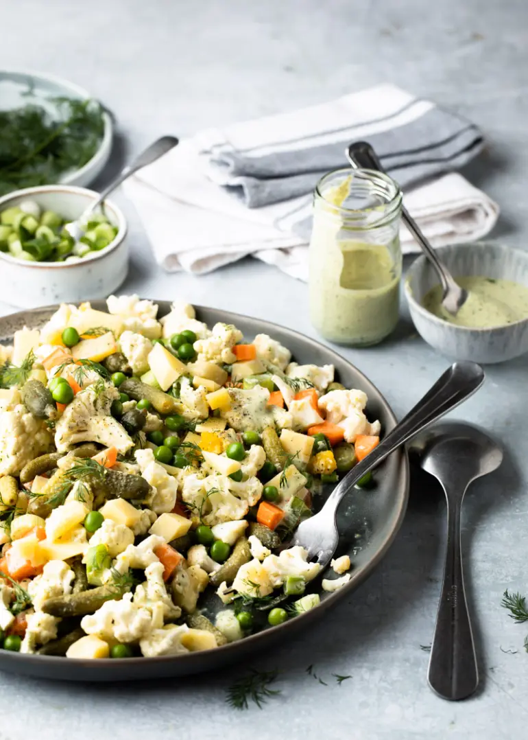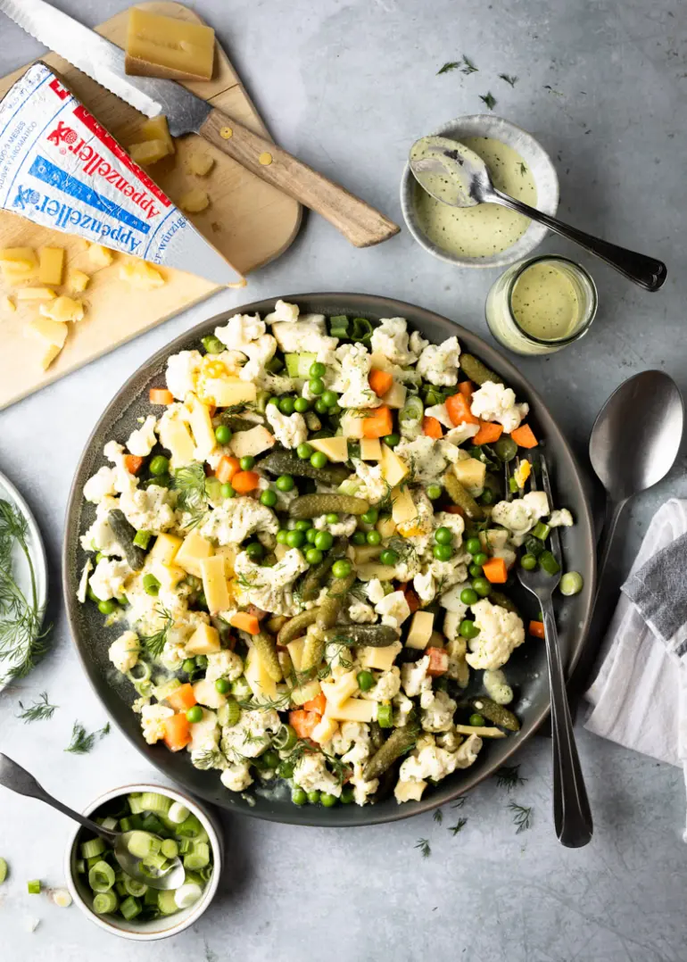 Voor deze koolhydraatarme huzarensalade gebruiken we geen aardappels en ook geen mayonaise. Hierdoor is hij lekker light, eet je veel groenten en smaakt hij toch heel romig. In plaats van de aardappels gebruiken we kleine bloemkoolroosjes in deze koolhydraatarme huzarensalade. Die kun je gewoon zo rauw eten. Omdat je alleen de doperwten en eieren hoeft te koken, heb je deze salade binnen 20 minuten op tafel staan. Lekker snel! Om de salade extra smaak te geven maken we een dressing van Griekse yoghurt, dille en ansjovis. Bestrooi tot slot met een flinke hand in blokjes gesneden kaas. Die geven deze salade extra pit en een heerlijk romige smaak. Lekker als lunch, bij de borrel of mee naar de picknick.