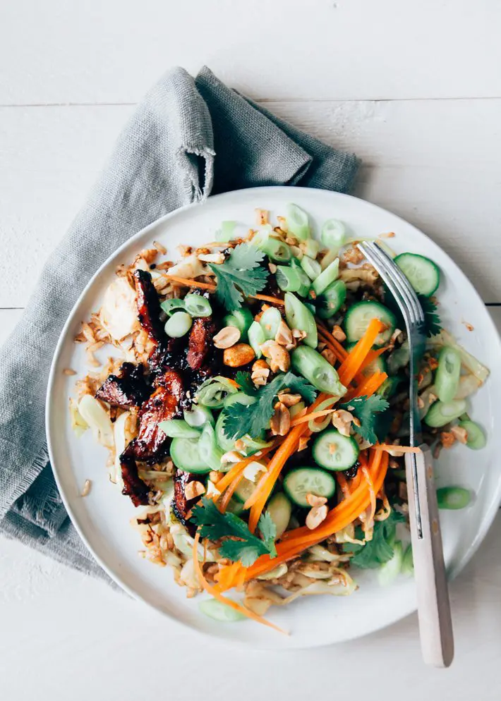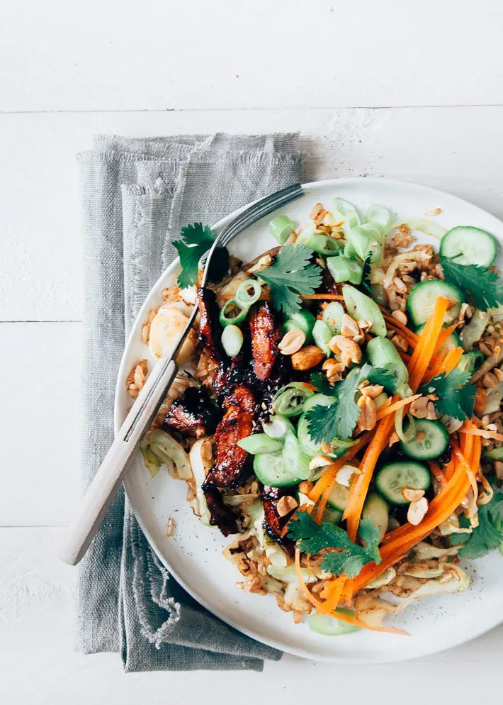 Verdeel de rijst en Koreaanse kip over de borden of kommen. En garneer met de wortel, komkommer, in ringetjes gesneden lente ui, verse koriander en pinda’s.