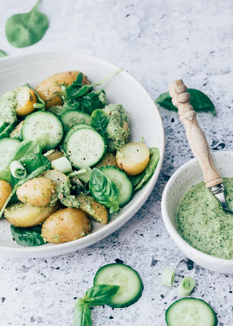 Deze heerlijke Green Goddess dressing lijkt een beetje op pesto. Maar is net wat verfijnder. Wel net zo makkelijk om te maken. Want je doet alle ingrediënten in het hakmolentje van je staafmixer, even mixen en klaar ben je. Dan is het alleen nog een kwestie van krielen koken en wat komkommer snijden.  Ook lekker bij de BBQ!