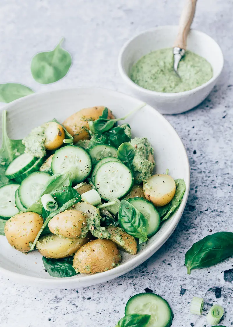 3. Snijd de komkommers in plakjes en de lente ui in ringen. Voeg deze samen met de spinazie bij de krieltjes. Voeg de dressing toe en meng alles door elkaar.