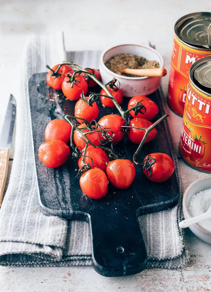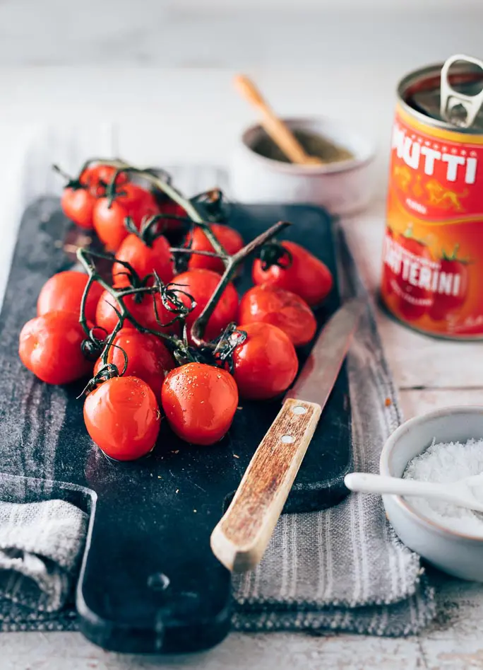 Verhit 1 eetlepel olijfolie in een koekenpan en bak de tomaatjes aan tak, 1-2 minuten tot ze een kleurtje krijgen. Haal ze heel voorzichtig uit de pan.
