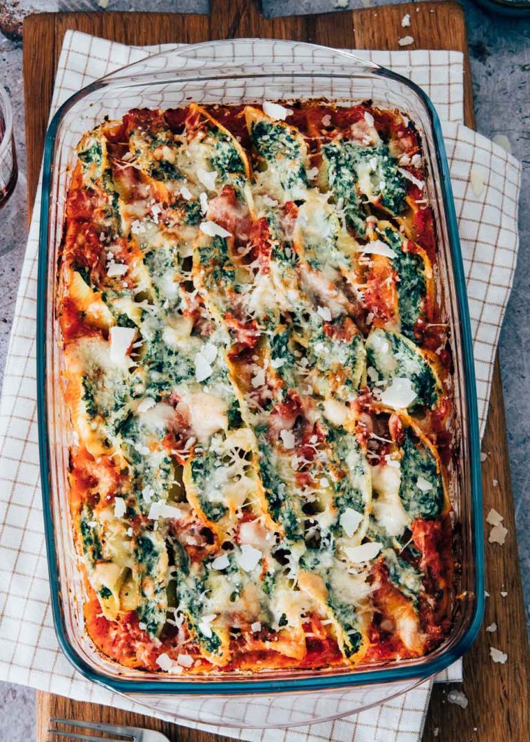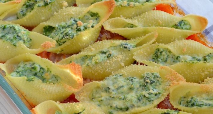 Wie wordt er niet blij van een lekkere pasta? Deze gevulde pastaschelpen met spinazie is weer eens wat anders dan de gewoonlijke pastagerechten. Je maakt deze gevulde pasta met grote pastaschelpen, in het Italiaans conchiglie genoemd. Ze zien er prachtig uit en doet ons zelfs een beetje denken aan de zee. Wij kochten deze pasta bij de Turk, maar de grotere supermarkten hebben ze ook in het assortiment. Het is dus even goed zoeken, maar het is echt een aanrader om deze gevulde pasta te maken!