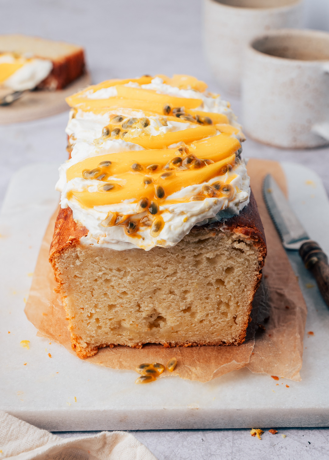 8. Verdeel het glazuur over de afgekoelde cake. Garneer met plakjes mango en de pulp van de passievruchten.