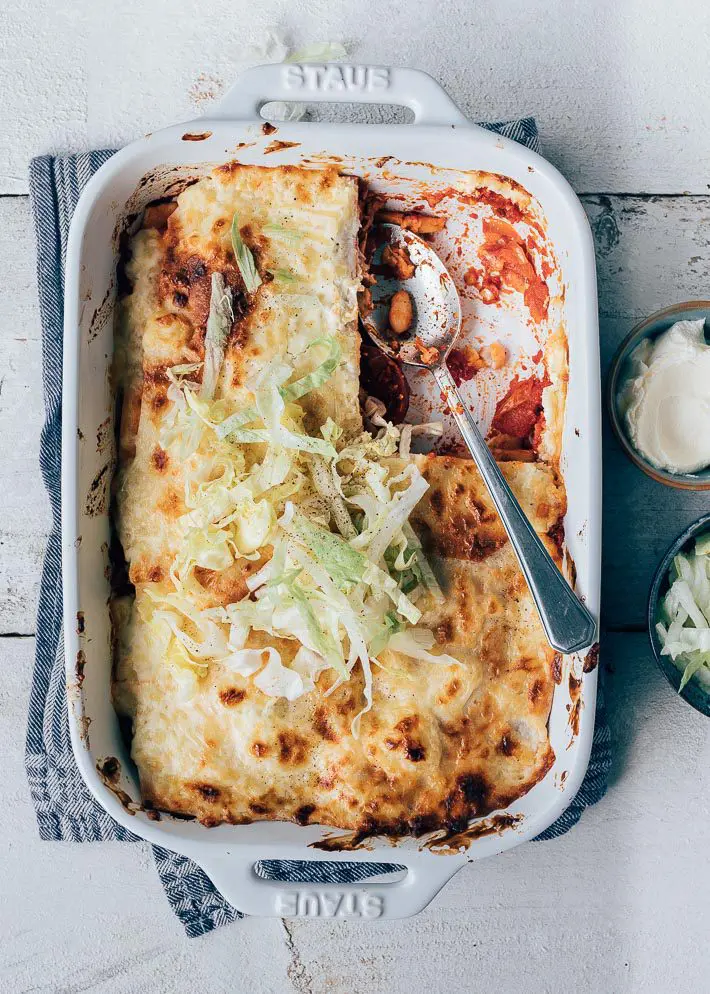 Meng de crème fraîche met de overgebleven kaas (50 gr) en bestrijk het laatste laagje wraps gul met het crème fraîche mengsel. Zet de Mexicaanse ovenschotel 20 minuten in de oven of tot de bovenkant mooi bruin kleurt.