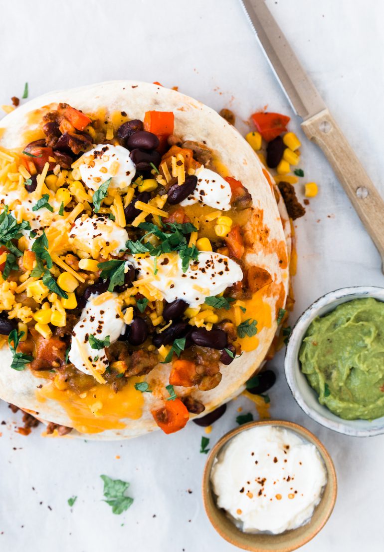 5. Plaats de tortillataart voor ongeveer 15 minuten in de oven, zodat de kaas goed kan smelten. Snijd de wraptaart in punten en serveer het uit.