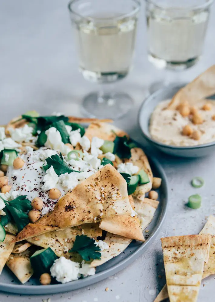 Verdeel de flatbread nacho’s over een schaal. Verdeel de labneh over het midden van de nacho’s. Strooi de kikkererwten, lente-ui en komkommer eroverheen. Verkruimel tot slot de feta over de nacho’s en maak het af met wat fijngehakte peterselie. Serveer de Midden Oosterse nacho’s met wat hoemoes.