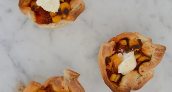 Garneer de Mexicaanse taartjes met wat geraspte cheddar en bak ze in ongeveer 25 minuten goudbruin. Als de bovenkant tussentijds te donker wordt, dek je deze af met wat aluminiumfolie.