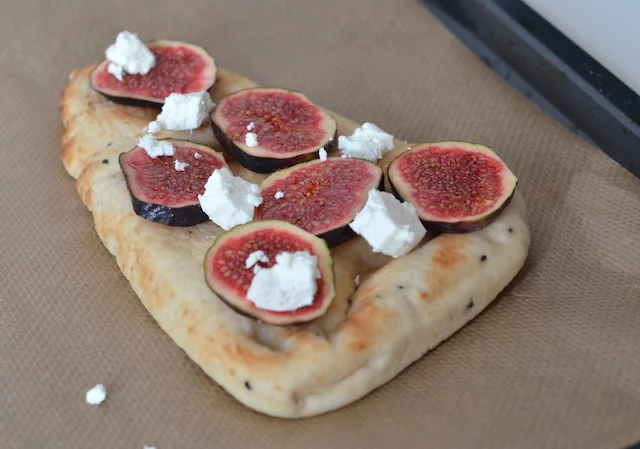 En tuurlijk vind ik het ook leuk om fancy uit eten te gaan en bij iedere gang betoverd te worden. Maar ik hou ook van pizza uit de doos op de bank. (Ja echt waar!) En mijn eigengemaakte pizza’s gaan natuurlijk boven alles, maar ook daar heb (neem) ik niet altijd tijd voor. Deze snelle versie flans je wel zo in elkaar. Nu moet ik toegeven dat ik het naanbrood gekocht hebt, bij Marks & Spencer in dit geval. Maar de super heeft het ook. En zelf maken is ook super makkelijk. Hier vind je een recept.