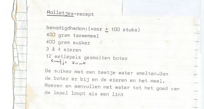 Het bakken van nieuwjaarsrolletjes was een traditie bij ons thuis. Met de hele familie zaten we om de tafel, mijn vader bakte de wafeltjes en wij rolden ze om de beurt om tot rolletjes. Met verbrande vingers tot gevolg. Je gebruikt hiervoor een speciaal wafelijzer (wij hebben deze) Deze traditie is bij mijn oma begonnen, die maakt ze vroeger altijd. Dit recept is ook nog van haar, ik had vroeger al een klein kookschriftje gemaakt en daar zat dit recept nog in. Helemaal vergeeld, maar echt de lekkerste rolletjes ooit. Er staat voor 100 rolletjes, maar dit hangt een beetje van de grootte af. Zelf haalden we er 80 uit. Probeer het zelf! PS probeer ook eens ons recept voor kniepertjes