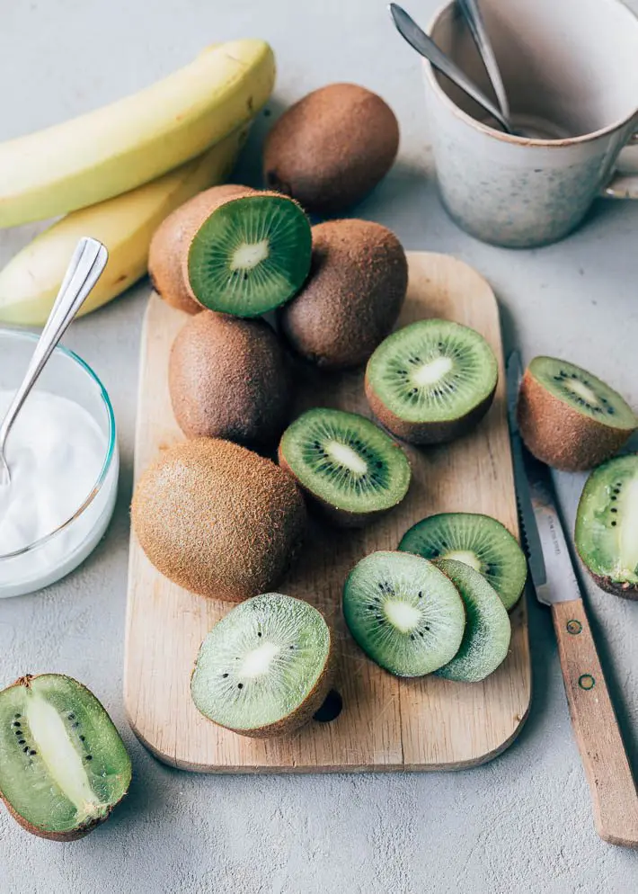 Deze ontbijtcake is extra lekker door de topping. Een royale laag romige kokosyoghurt. De yoghurt heeft een lichte kokossmaak en dat geeft de cake een tropisch tintje. Je kunt ook Griekse yoghurt gebruiken. Daarbovenop leggen we sappige plakjes kiwi. Dit geeft een frisse twist aan de cake. En het is ook nog heel gezond. Kiwi’s zit boordevol vitamine C. Geen fan van kiwi? Je kunt ook ander fruit kiezen, zoals appel, frambozen, aardbeien of bramen.