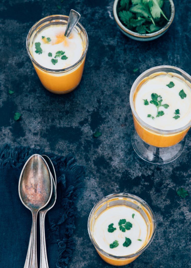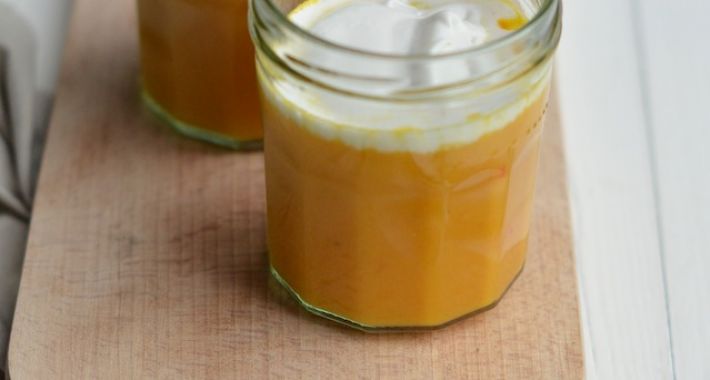11. Serveer de wortelsoep met kokosmelk in leuke glaasjes en voeg op het laatst een flinke lepel van de kokosroom toe.