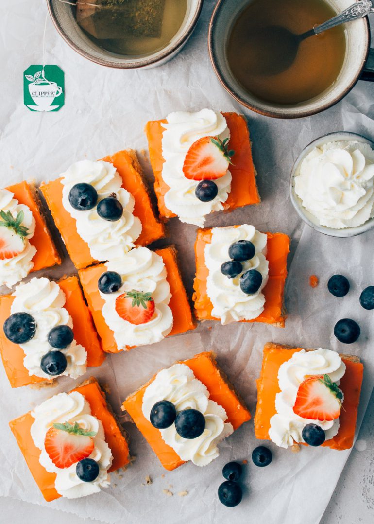 Snijd de randen van de oranjekoek, zodat je een mooie strakke koek krijgt. Snijd de oranjekoek vervolgens in 9 gelijke vierkantjes. 12 kan ook, maar dan heb je kleinere stukjes. Spuit de slagroom op de koek en garneer de oranjekoek met vers fruit.