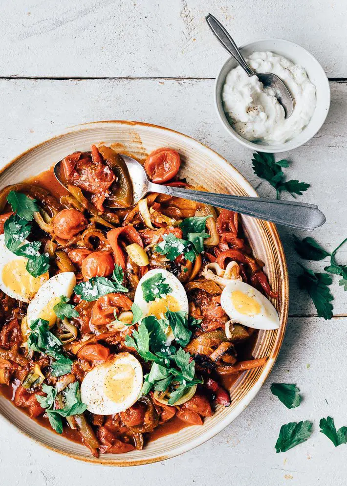 Lekkere groenteschotel met gestoofde paprika, prei, tomaten en gekookte eitjes. Heel makkelijk voor een doordeweekse dag, vegetarisch en snel bereid. Je kunt de groentestoof gewoon zo eten zonder bijgerecht, het is een volledige maaltijd. Wil je er nog iets bij eten? Kies dan voor een lekker stuk zuurdesembrood, zilvervliesrijst of gebakken aardappeltjes. Tip: snijd de paprika in dunne reepjes en bak daarna rustig aan. Als je het dan even laat stoven worden de paprikareepjes heerlijk zoet en super zacht.