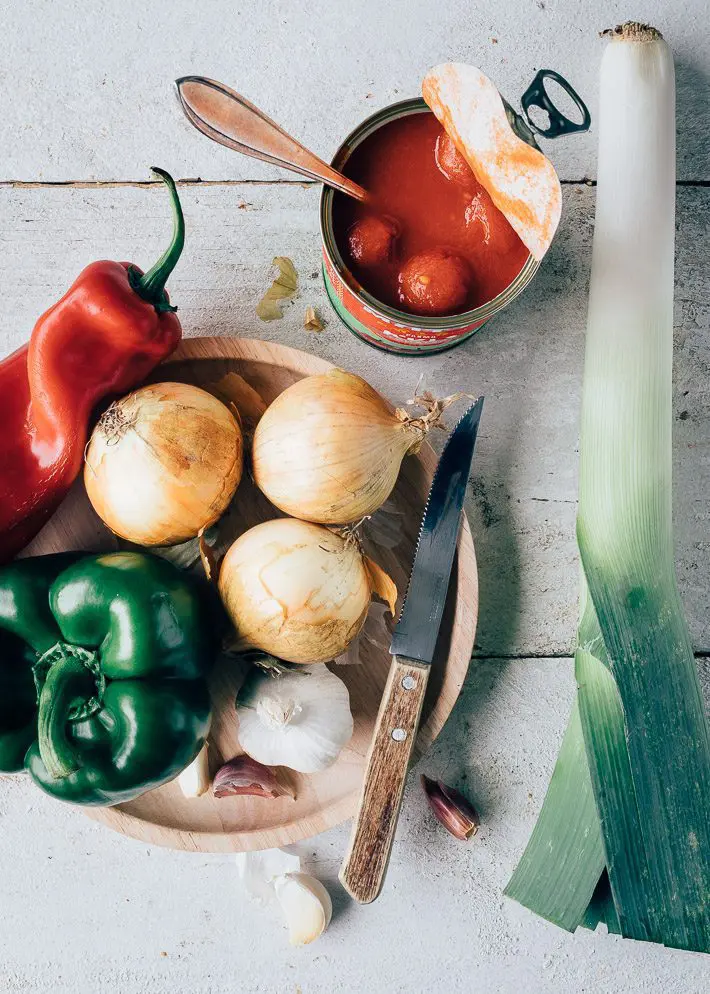 Snijd de paprika’s in dunne lange repen van ongeveer 1 cm dik. Snipper de uien en hak de tenen knoflook fijn en snijd de prei in dunne ringen.