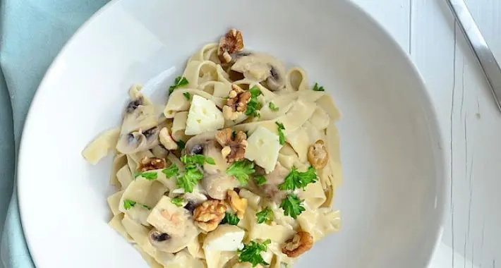 Deze pasta met de gorgonzolasaus is makkelijk te maken en ook nog eens snel klaar. Fijn voor als je weinig tijd hebt, maar wel zin hebt in een lekkere maaltijd. We maakten de pasta gorgonzola met champignons en voor een lekkere crunch met geroosterde walnoten. Wil je er nog meer groenten bij? Serveer er dan nog een salade bij.