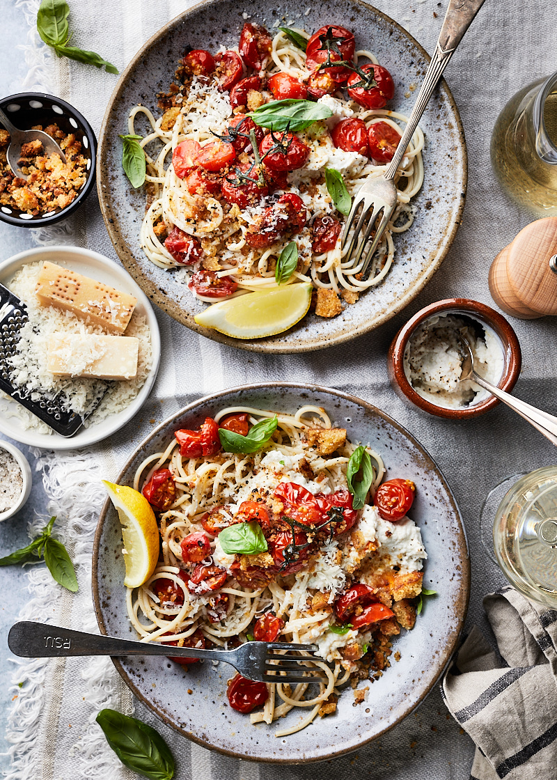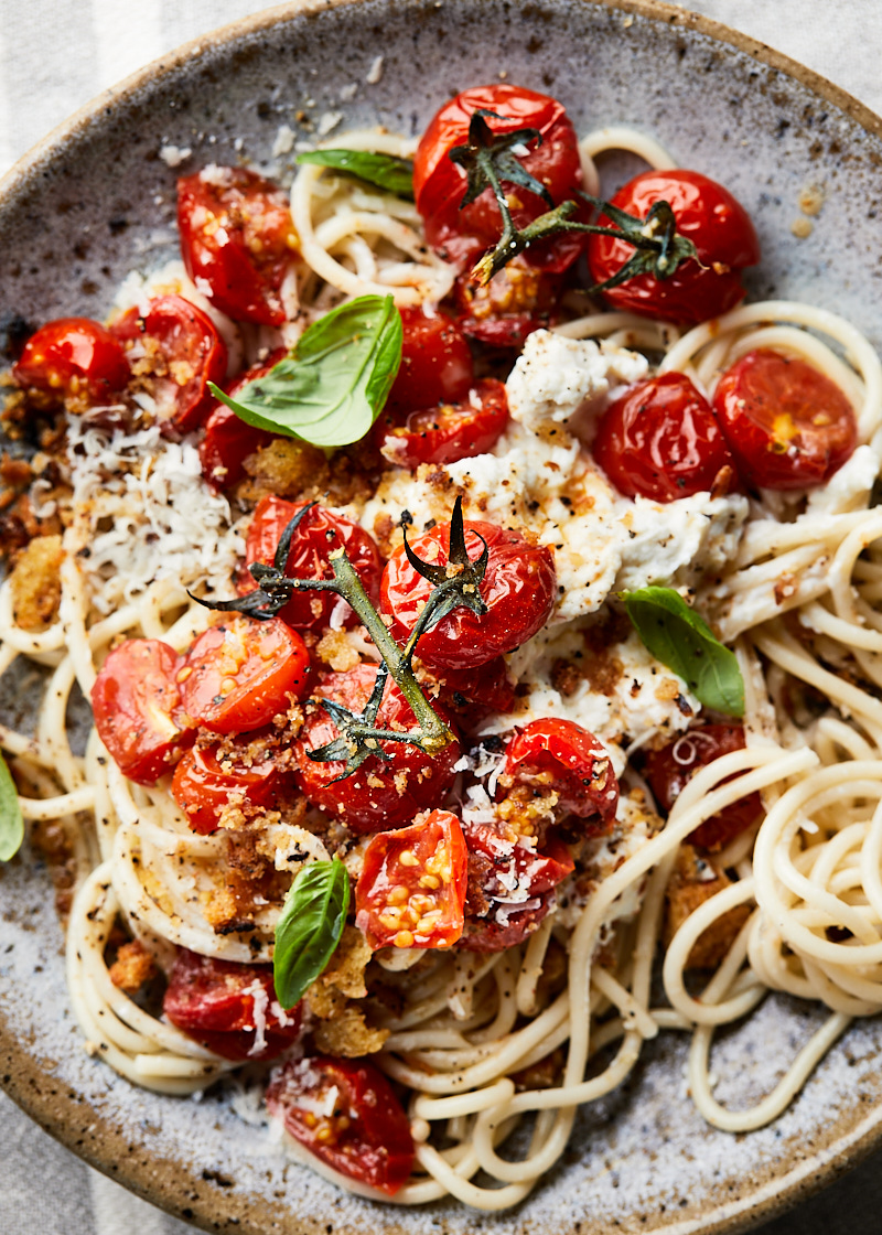 Ja: het kost even wat tijd om de tomaatjes te roosteren, maar geloof ons, dat geduld wordt rijkelijk beloond. De ricotta maakt het lekker romig, zonder dat het zwaar wordt, en het knapperige broodkruim (pangrattato!) zorgt voor een fijne bite.