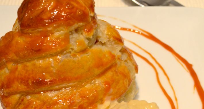 Bestrijk het bladerdeeg met de eidooier en bak de peren in ongeveer 20 minuten goudbruin.