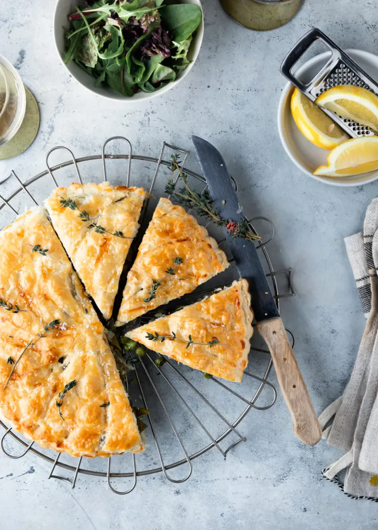 Heb je wel eens van een pithivier gehoord? Het is een Franse gesloten bladerdeegtaart (met een deksel dus). In de deksel kerf je een mooi patroontje, een soort swirl. Hij ziet er niet alleen mooi uit, maar is ook heel lekker. Van oorsprong werd hij zoet geserveerd (meestal met een frangipane vulling), maar hartig kan dus ook. Wij zijn gek op hartige taarten, ze zijn makkelijk om te maken en je kan er lekker mee variëren. Je hebt ze in alle vormen en maten; van zelfgemaakt kruimig deeg, tot bladerdeeg of filodeeg en van rond tot rechthoekig. Ook qua vulling kan je alle kanten op. In dit Pithivier recept gaat een lekkere vegetarische vulling met asperges, sperziebonen, doperwten en geitenkaas. Ben je geen fan van geitenkaas probeer dan eens geraspte gruyère.