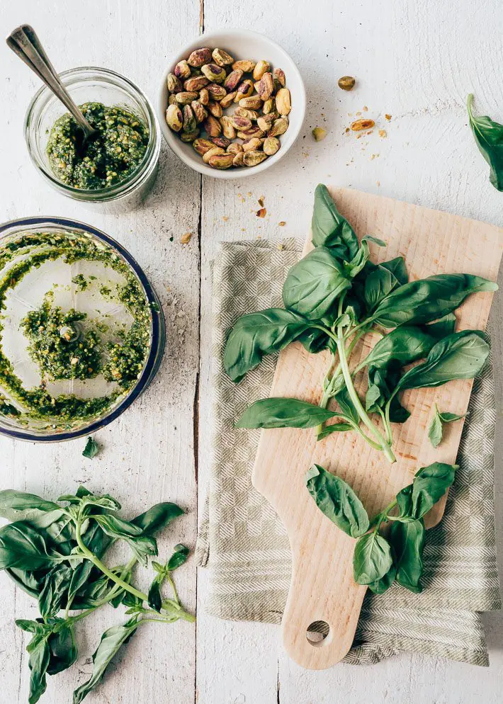 Maak de pesto. Doe de basilicum, pistachenootjes, Parmezaanse kaas en olijfolie in het hakmolentje van de staafmixer en hak alles fijn tot dat er een glad mengsel ontstaat. Wanneer het te droog is, dan voeg je nog wat extra olijfolie toe. De pesto moet lekker smeuïg worden. Breng op smaak met peper en zout.