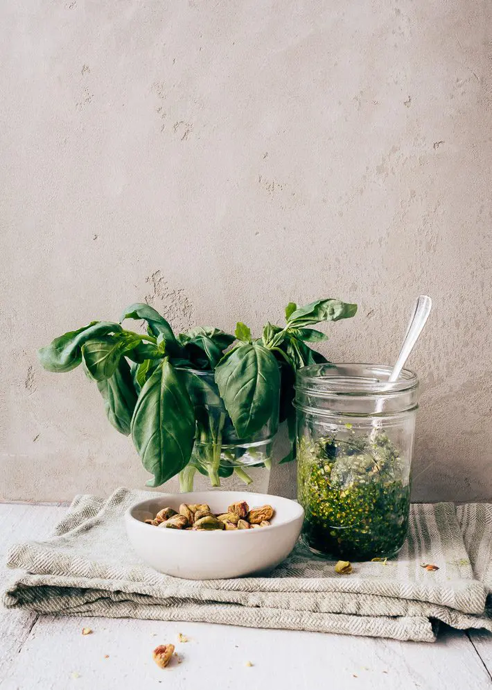 Bestrooi met nog wat fijngehakte pistachenootjes en verse basilicum.