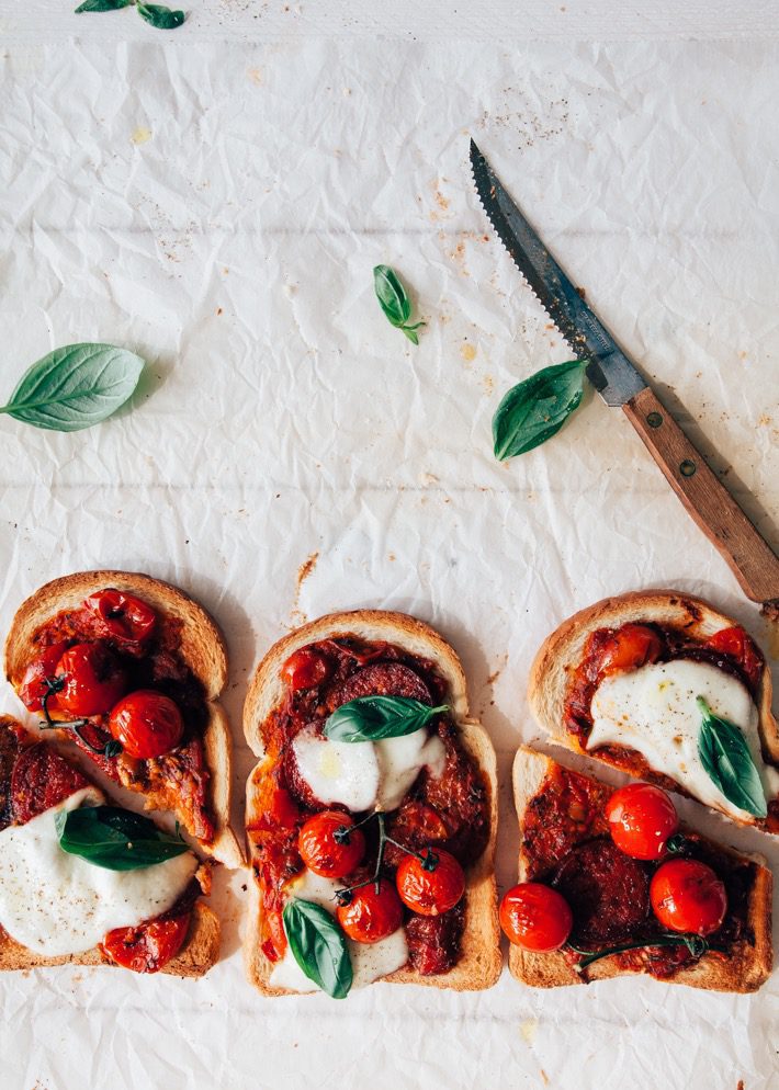 Bruschetta is niets meer dan geroosterde boterhammen met lekkere toppings erop. Het is dé ideale manier om oud brood weer nieuw leven in te blazen. In Italië staat het overal op de kaart. Wij maken het graag voor de lunch maar serveren het ook als hapje bij de borrel. Het meest bekende bruschetta recept is denk ik deze bruschetta caprese, oftewel bruschetta met tomaat en mozzarella. Een allemansvriend want bijna tederen vindt dit lekker. Eigenlijk is het gewoon een pizza boterham, ideaal ook om de kleine gasten mee te verleiden. Liever vega? laat de chorizo dan achterwege.