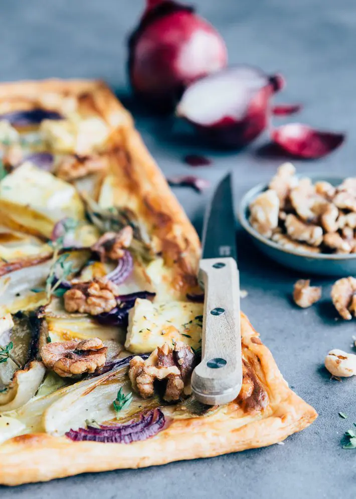 Verdeel de witlof over de plaattaart. Snijd de brie in stukjes en de rode ui in ringen. Verdeel dit ook over de plaattaart. Strooi de walnoten over de plaattaart.