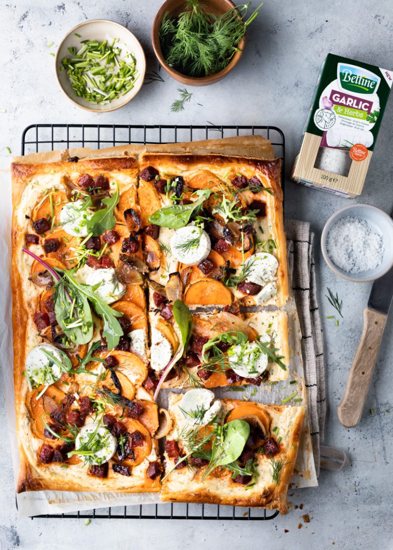 Deze plaattaart zoete aardappel wordt extra lekker door de romige vulling van geitenkaas en ricotta. Geitenkaas is trouwens niet alleen lekker op deze plaattaart, maar ook bij de borrel, door de pasta of in deze frittata.