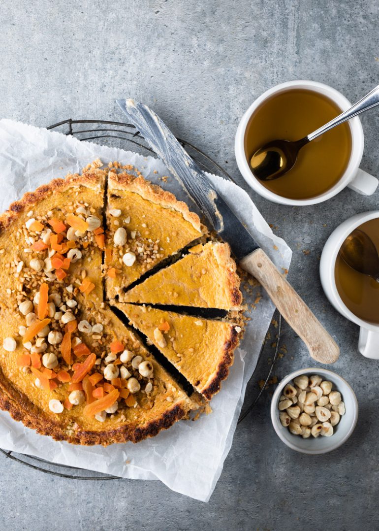 Schep de afgekoelde pompoenblokjes samen met de abrikozen in een blender of hoge maatbeker, pureer de pompoen helemaal glad. Voeg dan de slagroom, 2 eieren en 2 eidooiers toe. Roer de koekkruiden er door en pureer de vulling nog een keer goed glad.