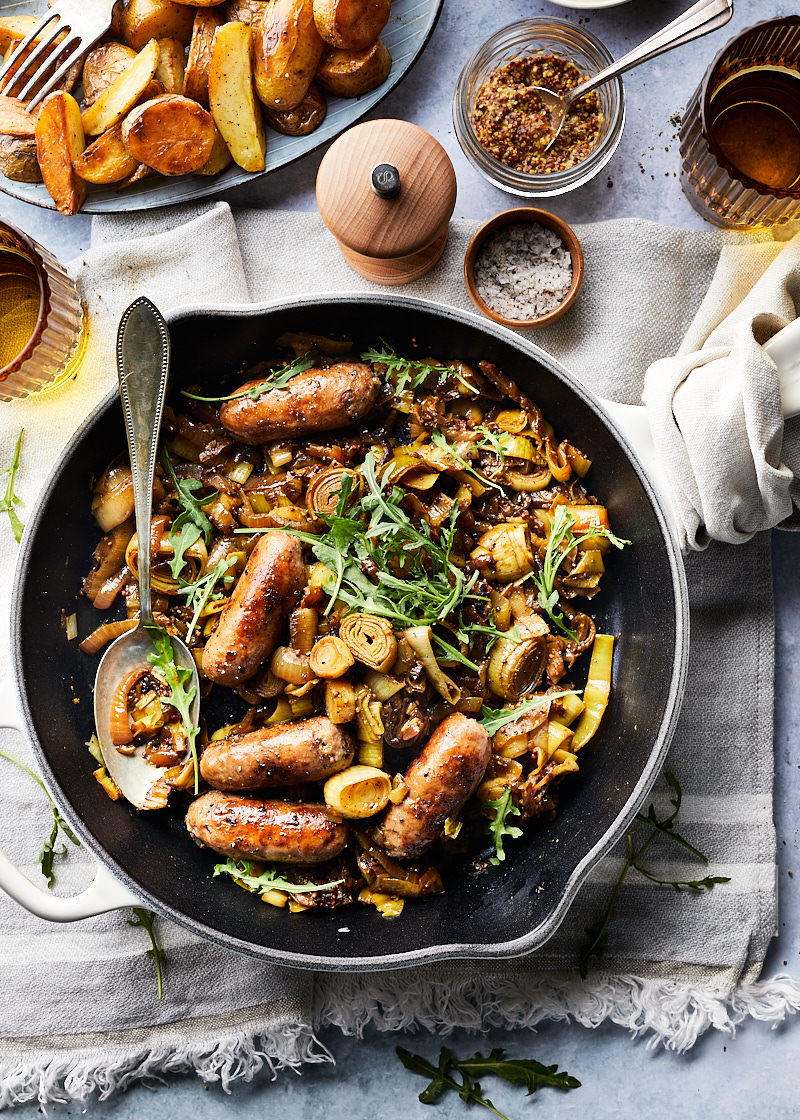 Bak ondertussen de worstjes in een aparte koekenpan, in wat olie in circa 10 minuten goudbruin en gaar (de tijd kan variëren, afhankelijk van de dikte van de worstjes).