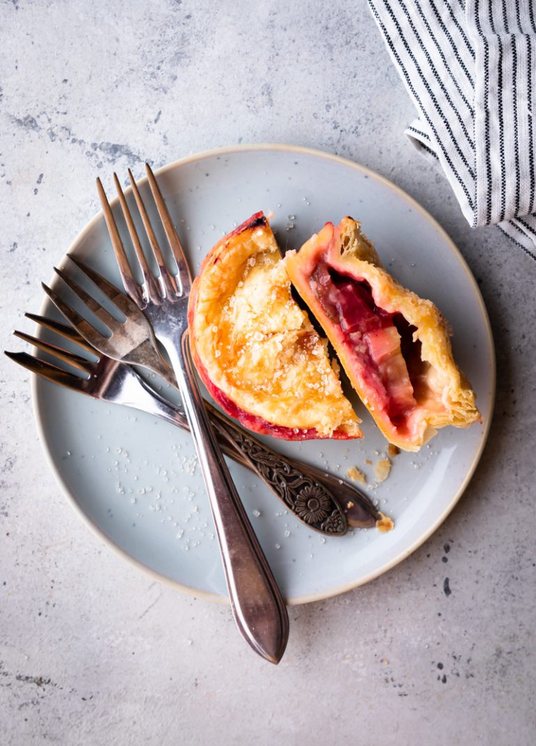 Snijd uit het bladerdeeg 8 rondjes van 8 centimeter doorsnede, en 8 rondjes van 6 centimeter doorsnede. Leg grote rondjes in een ingevette muffingvorm. Prik met een vork gaatjes in de bodem, bestrooi met wat havervlokken en vul de bladerdeegbakjes met de rabarbermix. Bedek elk bodempje met een dekseltje van bladerdeeg. Druk de randjes goed aan.