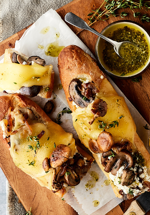 De ster van dit broodje is raclette-kaas. Lekker als je ouderwets gaat racletten, maar zeker ook op zo’n broodje als deze. Voor dit gerecht laten we plakken raclette-kaas smelten over de vulling in de oven, waardoor een onweerstaanbare goudbruine laag kaas ontstaat. Als finishing touch, besprenkelen we het broodje met een zelfgemaakte pesto-olie, die dit raclette kaasbrood helemaal afmaakt.