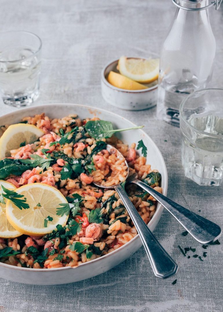 Risotto is echt een crowd pleaser! Wij zijn er in ieder geval dol op. Het is net als pasta enorm veelzijdig. Van een tomatenrisotto tot een bietenrisotto je kunt er werkelijk alle kanten mee op. Vandaag een risotto met garnalen en spinazie. Dit recept is heel simpel te maken, je hebt alleen wat tijd nodig om de risottorijst te laten garen. Wij vinden dat altijd wel een rustgevende bezigheid zo 1 voor 1 een soeplepel bouillon aan de risotto toevoegen tot de risotto gaar is (dat duurt ongeveer 35 minuten). Je maakt hem met tomaten, venkelzaad en spinazie. Het romige van de risotto past daar perfect bij. De Hollandse garnalen roer je net als de spinazie er het laatste moment doorheen, beiden hebben niet zoveel tijd nodig om garen en op te warmen. Voor een extra romig resultaat kun, wanneer de risotto klaar is, nog een klontje roomboter door de risotto heen roeren. Buon Appetito!