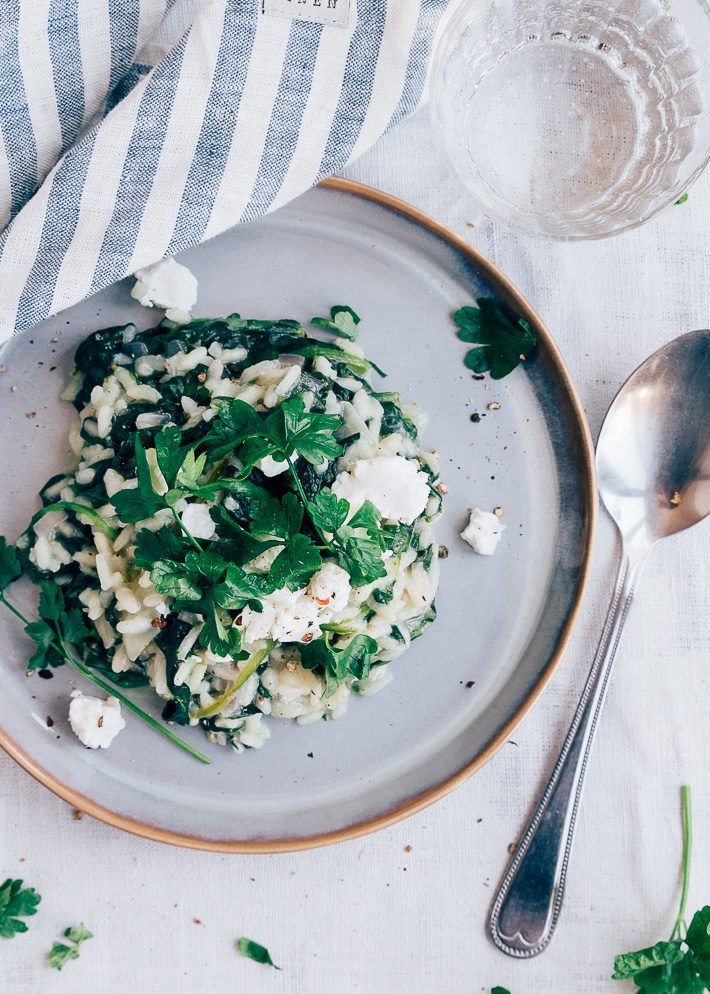 In kookprogramma’s zoals Masterchef wordt altijd heel ingewikkeld gedaan over het maken van risotto. Het zou namelijk heel moeilijk zijn om een goede risotto te maken. Ik vind van niet! Als student at ik iedere week risotto en als ik nu even niet weet wat ik moet maken, kies ik ook vaak voor dit gerecht. Je kan er zoveel kanten mee op en het is de ideale restverwerker van je koelkast. Bijna alle groente- en kaassoorten kan je wel in de risotto gooien. Deze risotto met spinazie en geitenkaas is in ieder geval heel goed gelukt. Door de geitenkaas wordt hij extra romig. Yum!