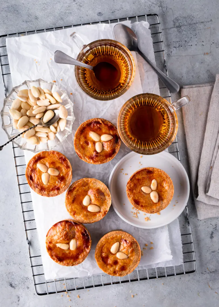 Rol het overige deeg uit en steek daar cirkels uit die groot genoeg zijn om de bovenkant te bedekken en plaats deze op de spijsvulling. Bestrijk de bovenkant met losgeklopt ei en druk drie amandelen op de koek. Bak de koeken in 25-30 minuten goudbruin en gaar. Laat de rondo koeken ongeveer 15 minuten afkoelen, haal ze uit de muffinvorm en laat ze verder afkoelen op een rooster.