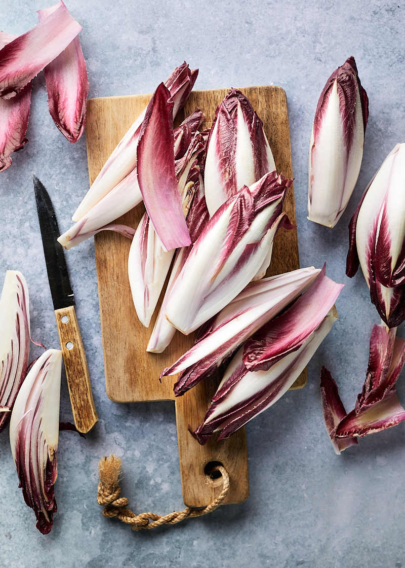 3. Snijd terwijl de peren afkoelen de onderkant van de stronkjes roodlof en verwijder eventueel de buitenste blaadjes. Haal de rest van de blaadjes los en snijd de helft van de roodlof in dunne reepjes. Leg de blaadjes en reepjes op een grote schaal. Snijd de brie in plakjes. Hak de pecannoten grof.