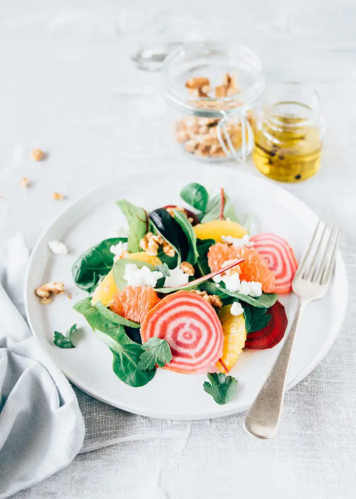 Bietjes, zowel rauw al gekookt combineren perfect met kaas. In dit geval geitenkaas, maar feta, burrata of cottage cheese zijn ook lekker in dit recept. Het frisse citrusfruit maakt het helemaal af.