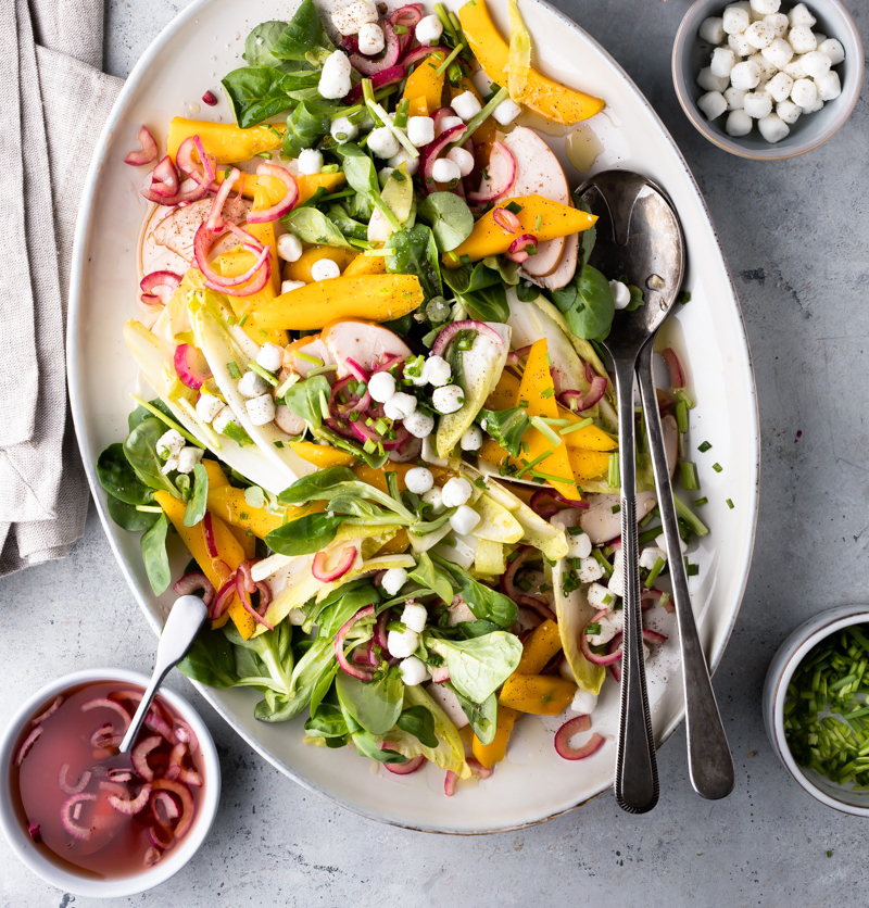 Simpele maar oh zo lekkere salade met mango. Hij staat in 20 minuten bij jou op tafel. We combineerden zoete plakjes mango met frisse veldsla, schuitjes fijne witlof, plakjes gerookte kip en romige geitenkaas. De salade geef je extra pit met ingelegde zoetzure rode uiringen die je 15 minuutjes in rode wijnazijn en ahornsiroop laat marineren. Fijngehakte bieslook er over en je salade is niet alleen heel lekker, maar ook nog eens een plaatje!
