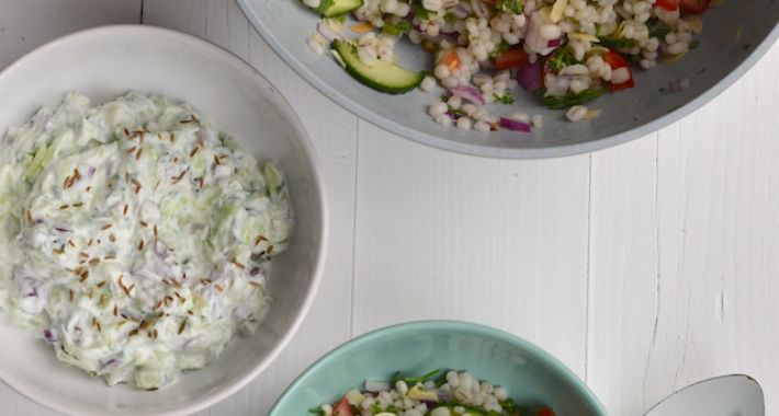 Haal de pitten uit de dadels en snijd in kleine stukjes. Hak de munt en dille fijn. Meng de courgette, zongedroogde tomaten, kruiden en dadels door de parelgort. Verkruimel de feta over de parelgort salade. Drizzle er tot slot nog wat olijfolie over.